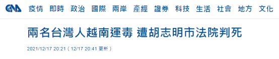 台媒:兩名台灣人在越南運送超600公斤重毒品,被當地法院一審判處死刑