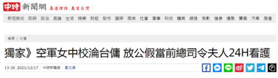 據報道,有台軍方人士日前在臉書發文爆料,稱在醫院見到一名女軍官,她不是來看病,竟然是被某退將夫人指定來伺候的,這名女軍官給住院的“退將夫人”把屎把尿換內褲。該爆料人士還稱,“我向來就痛恨長官把女軍官當女侍使用,現在更是刷新我的認知,竟然還要受命當免費台籍看護”。