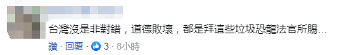 還有人稱,“台灣沒是非對錯,道德敗壞,都是拜這些垃圾恐龍法官所賜。”“要這種‘法律’,要這種法匠(法官)幹什麼?6條人命!這是在鼓勵犯罪。”