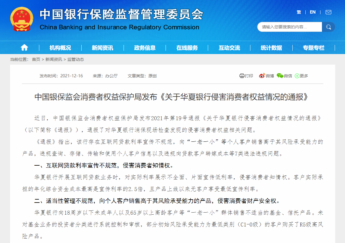 【環球網綜合】12月16日,中國銀保監會消費者權益保護局發佈《關於華夏銀行侵害消費者權益情況的通報》,通報華夏銀行存在互聯網貸款利率宣傳不規範,向“一老一小”等個人客户銷售高於其風險承受能力的產品,違規查詢、存儲、傳輸和使用個人客户信息以及違規向貸款客户轉嫁成本等7類違法違規問題。