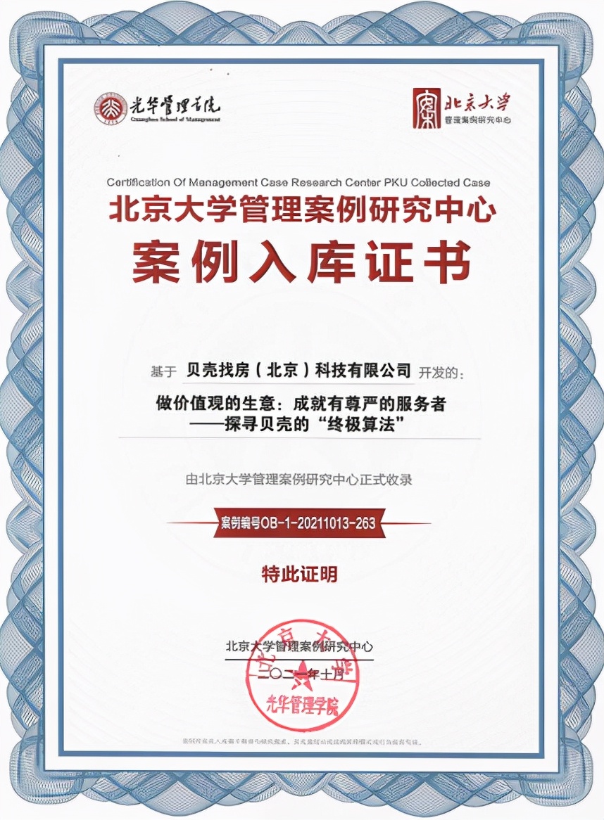 近日,根據貝殼找房開發的案例《做價值觀的生意:成就有尊嚴的服務者 ——探尋貝殼的“終極算法”》(以下簡稱《案例》)正式被收入北京大學管理案例研究中心案例庫,將用於北京大學光華管理學院本科及MBA等項目課程教學,併為企業文化戰略制定與實施提供參考。