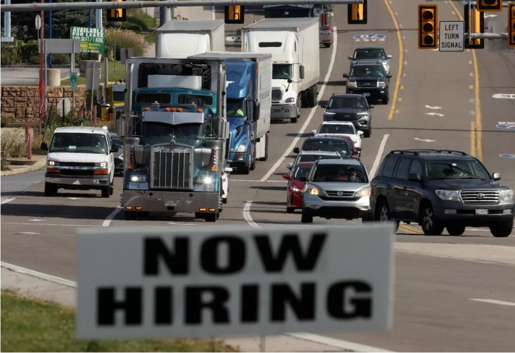 當地時間2021年10月14日,美國賓夕法尼亞州的路邊招聘廣告牌。司機的缺乏加劇了當地供應鏈的緊張。