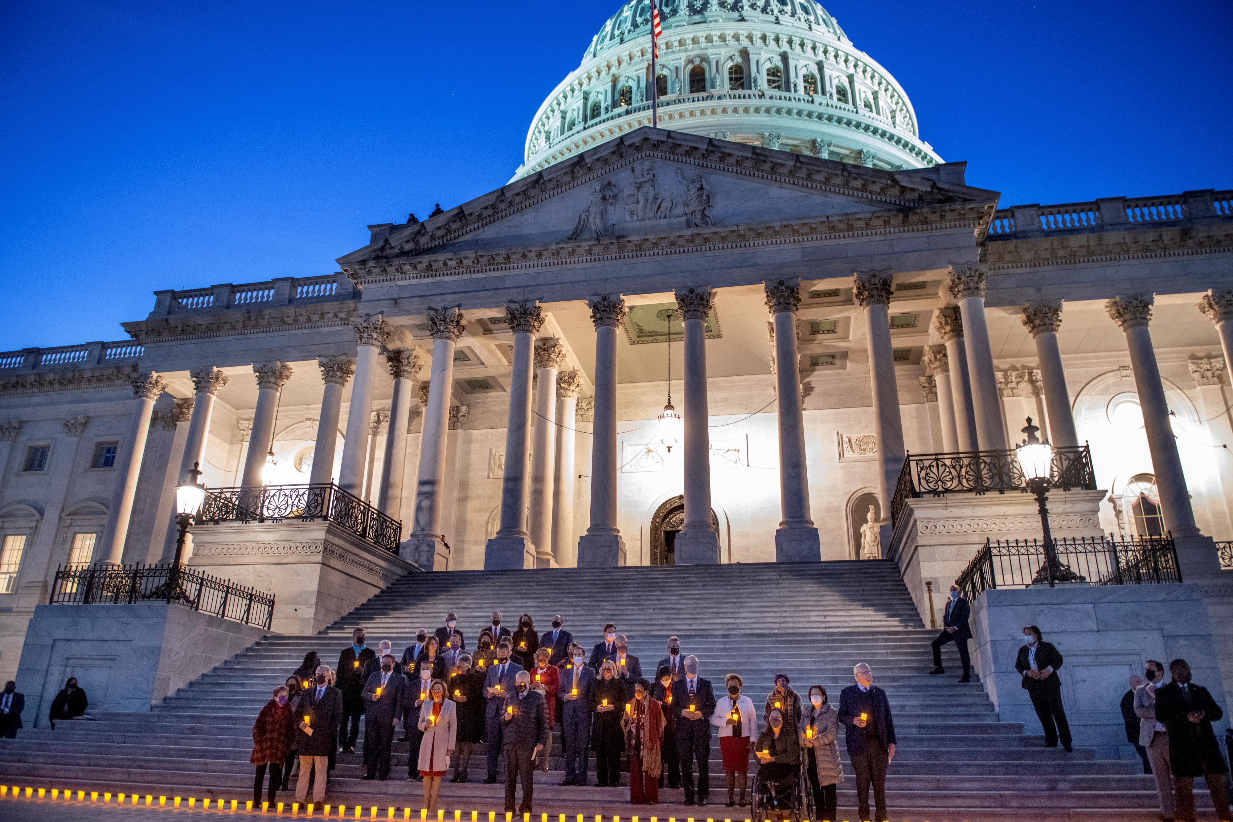 當地時間2021年12月14日,美國首都華盛頓特區,參、眾兩院主要議員在美國會大廈舉行守夜活動,悼念因新冠死亡的80萬人。