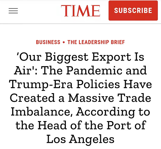 洛杉磯港執行董事吉恩·塞羅卡接受《時代週刊》採訪時表示,特朗普政府發動貿易戰傷害了美國出口商特別是農民。在洛杉磯港,滿箱進出口比例是5比1,“這意味着我們最大的出口產品是空氣”。