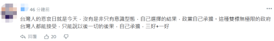 另有網友直言,“台灣人的悲哀日就是今天,沒有是非只有意識型態”,這種雙標無極限的“政府”(指民進黨當局)島內一些人都能接受,只能説以後一切的後果,自己(指民進黨的支持者)承擔。↓