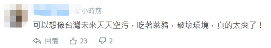 還有網友諷刺,“可以想象台灣未來天天空污(指空氣污染),吃着萊豬,破壞環境”。↓