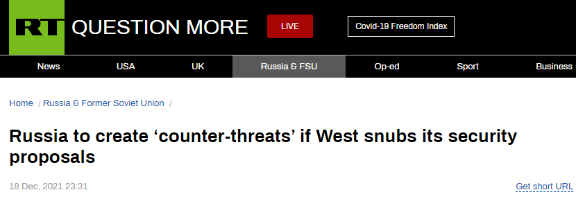 據報道,關於俄方17日提出的俄羅斯與美國和北約關於安全保障的條約草案,格魯什科表示:“通過草案我們清楚地表明,我們準備討論如何將軍事或軍事技術方案轉變為政治進程,以加強歐洲安全與合作組織、歐洲-大西洋地區和歐亞大陸內所有國家的軍事安全。” 不過,格魯什科同時強調,如果西方無視莫斯科試圖緩和緊張局勢的努力,俄羅斯將訴諸於自己的“反制威脅”措施。報道稱,格魯什科提出的“反制威脅”措施指的是可能在俄羅斯境內部署新武器系統。