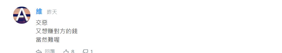 該消息也引發島內網友關注,有網友表示“交惡 又想賺對方的錢 當然難喔”“各人造業各人擔”↓
