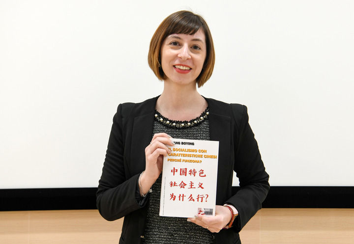 樂小悦輕輕拿出一本白色封面的書,上面赫然印着意大利文和中文的書名《中國特色社會主義為什麼行?》。書的譯者,就是樂小悦。