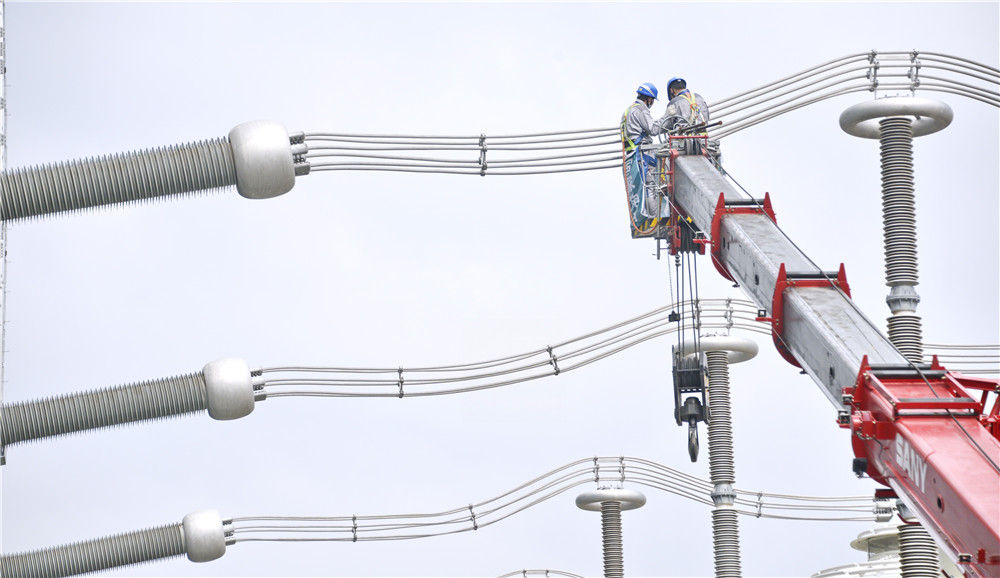 2021年9月25日,國網北京市電力公司延慶換流站的員工在檢查輸變電設備。新華社記者 李欣 攝