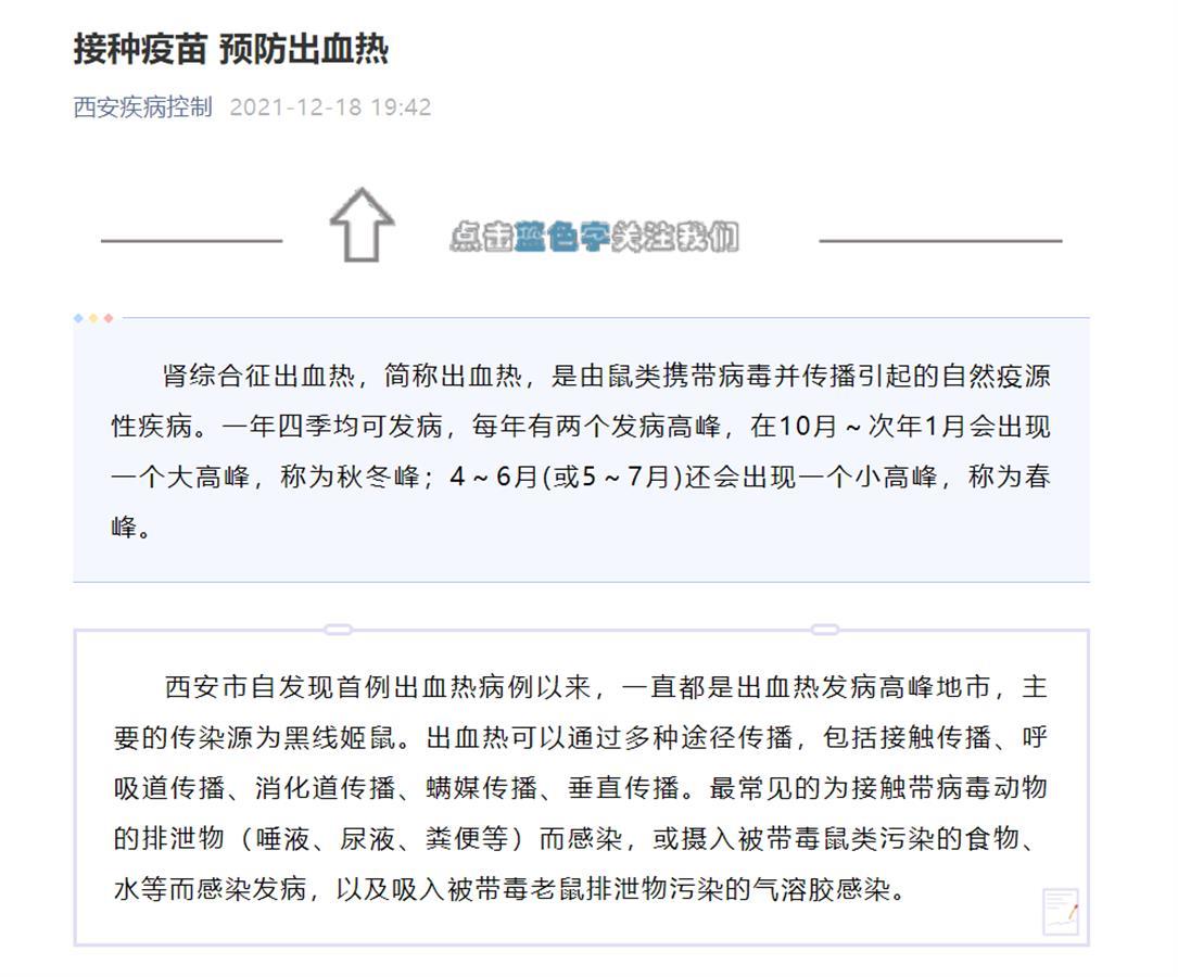 西安疾控還稱,目前,該市新到貨一批出血熱疫苗,正陸續下發至重點區縣、重點鄉鎮的接種單位。高發地區16-60歲的適齡人羣,均可至就近接種點規範全程接種出血熱疫苗,獲得免疫力。