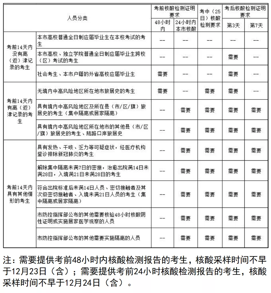 *【特別提醒】考前14天內有離(返)津記錄的考生,12月26日考試入場時須提供12月25日的核酸檢測陰性證明。*為方便此類考生25日進行核酸檢測,市高招辦將協調各區疾控機構派出專業人員進入考點,現場進行核酸採樣。考生可選擇25日下午在考點進行核酸檢測。