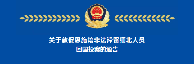 為堅決貫徹落實黨中央決策部署,嚴厲打擊電信網絡詐騙犯罪,整治中緬邊境違法犯罪活動,維護社會安定,保護人民羣眾生命財產安全,根據有關法律法規,現就敦促恩施籍非法滯留緬北人員(以下簡稱滯留緬北人員)回國投案事項通告如下: