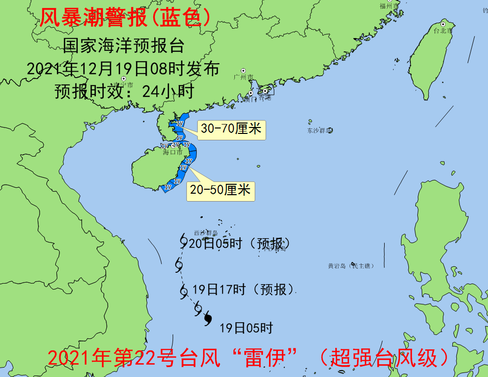 同時發佈風暴潮藍色預警:預計12月19日上午至20日上午,雷州半島東部沿海將出現30到70釐米的風暴增水,海南島北部和東部沿海將出現20到50釐米的風暴增水。上述岸段內的海南清瀾和秀英潮位站將分別於19日夜間和20日早晨出現達到當地藍色警戒潮位的高潮位。海南省海口市和文昌市的風暴潮預警級別為藍色。