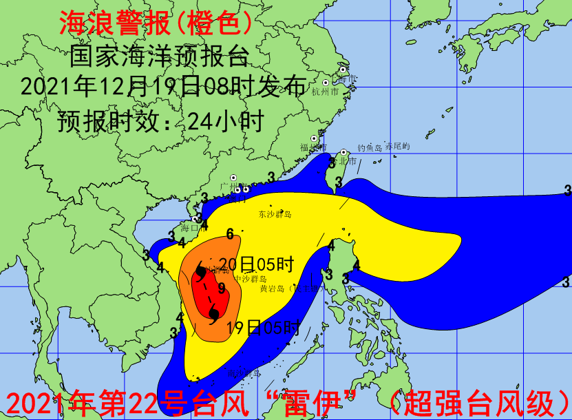 受今年第22號颱風“雷伊”(超強颱風級)和冷空氣的共同影響,預計12月19日中午到20日中午,南海西部將出現6到10米的狂浪到狂濤區,該近海海域海浪預警級別為橙色;巴士海峽、南海北部將出現4到5米的巨浪區;海南東部、南部近岸海域將出現3到5米的大浪到巨浪,該近岸海域海浪預警級別為橙色;廣東近岸海域將出現2到3.4米的中浪到大浪,該近岸海域海浪預警級別為藍色。