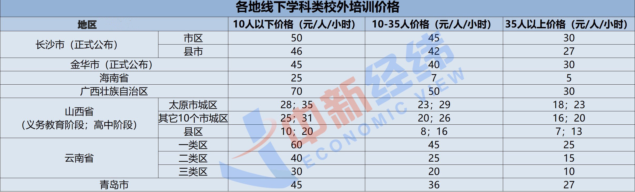廣西壯族自治區發改委徵求意見時表示,10人以下班型基準價為每人次70元/課時,10至35人的班級基準價為每人次50元/課時,35人以上為每人次30元/課時。同時其強調,不得一次性收取或以充值、次卡等形式變相收取時間跨度超過3個月或 60 課時的費用。