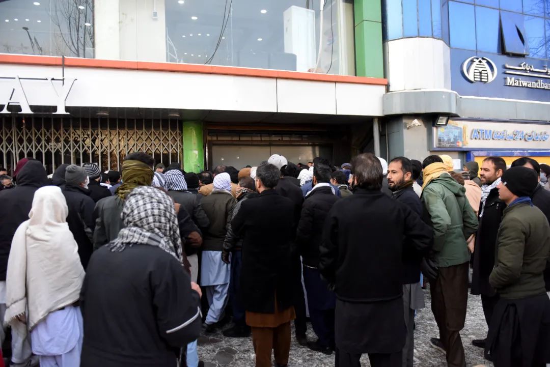 12月18日,人們在喀布爾一家銀行門口排隊等待取錢。新華社報道員薩菲攝