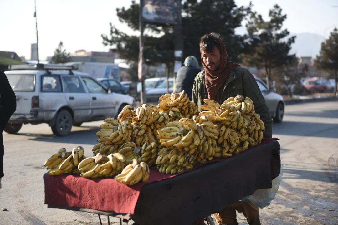12月16日,喀布爾街頭賣香蕉的商販。新華社報道員 阿里亞攝