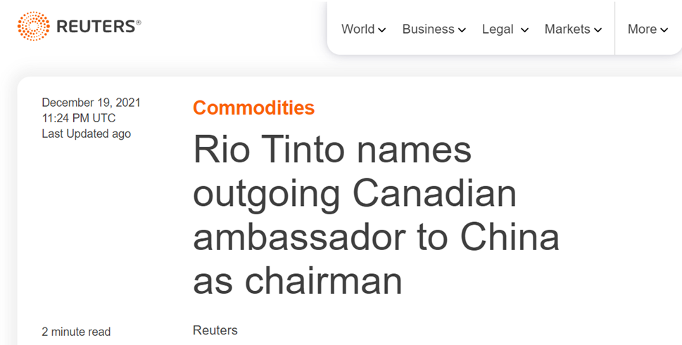 【環球網報道】即將卸任的加拿大駐華大使鮑達民(多米尼克·巴頓),要重返商界了。據英國路透社20日報道,鮑達民將接任西蒙·湯普森,成為全球礦業巨頭——力拓集團董事長。該集團表示,鮑達民將於2022年 4 月 4 日加入董事會,於5 月 5 日出任董事長。值得一提的是,鮑達民是在中加關係因孟晚舟事件惡化後臨危受命,被加總理特魯多任命為駐華大使的,如今該事件已解決,但它無疑是鮑達民駐華大使工作經歷中應對的最重要任務之一。