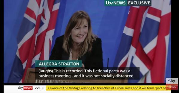 此前曝光的一段視頻顯示,在據説是2020年12月22日拍攝的一段發佈會彩排視頻中,唐寧街10號的助手們就一場在唐寧街10號舉辦的聖誕派對談笑風生。其中,斯特拉頓還開玩笑似地描述了當時的情況,稱那是一場“沒有社交距離限制的聚會”。