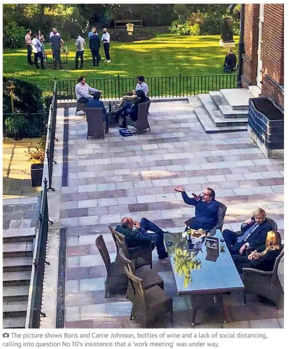 據報道,《衞報》刊登的這張照片是在2020年5月拍攝的。照片中,約翰遜和妻子凱莉抱着他們剛出生的孩子,圍坐在一張擺放着奶酪和紅酒的桌子旁,旁邊還坐着兩名據信是公職人員和助手的人。