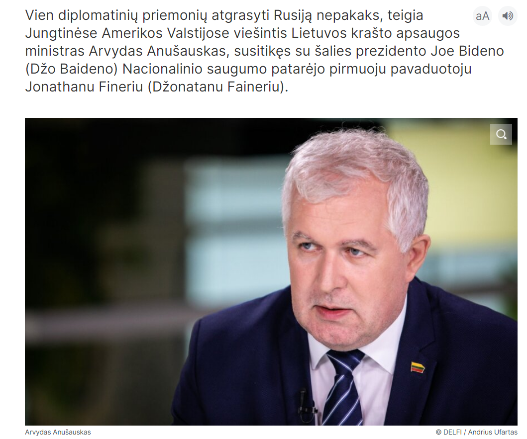 LRT稱,阿努紹斯卡斯在訪美期間會見了白宮和美國國會代表,還跟五角大樓官員討論了烏克蘭局勢。回國後,阿努紹斯卡斯在“今日話題”節目中稱,立陶宛需要為烏克蘭提供支持。他表示,目前有多個國家成為了烏克蘭的主要後盾,而立陶宛就是其中之一。在談及美國和北約組織是否應該更多地參與烏克蘭防務問題時,阿努紹斯卡斯稱,我們需要加緊與烏克蘭的聯繫,不能認為僅僅依靠外交工具就足夠了。