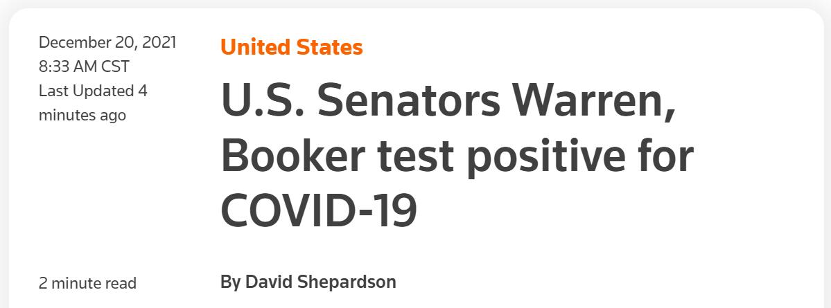 【環球網報道】綜合美國有線電視新聞網(CNN)、路透社報道,美國民主黨籍參議員伊麗莎白·沃倫與科裏·布克當地時間19日分別發推文透露,自己新冠病毒檢測結果呈陽性。