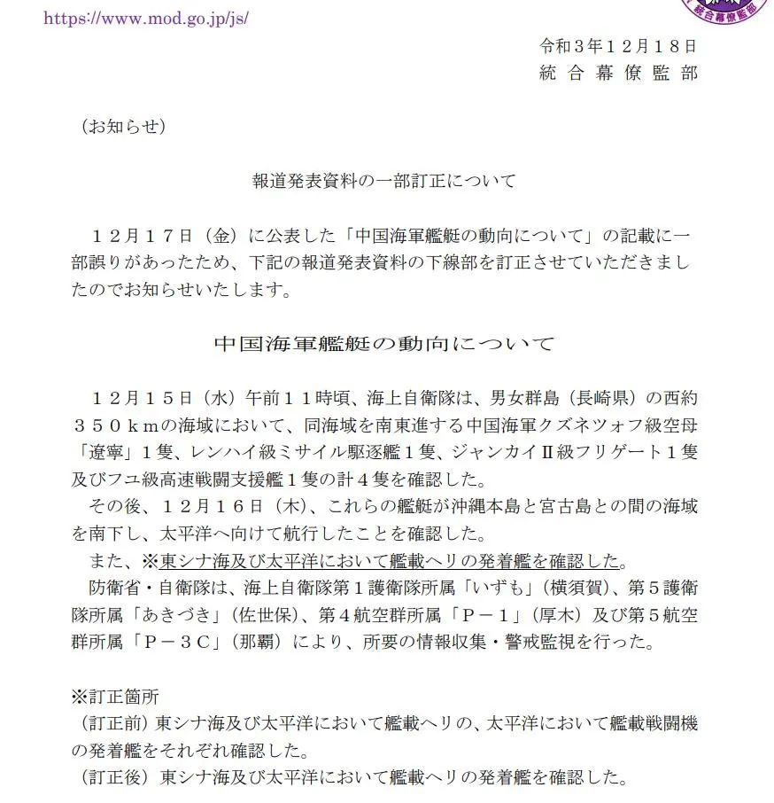按照日方17日的説法,15日上午,日本海上自衞隊在東海海域發現包括航母遼寧艦在內的4艘中國海軍艦艇向東南方向航行,消息中還提到中國航母編隊在東海和太平洋均進行了艦載直升機起降訓練,進入太平洋後演練了殲-15艦載戰鬥機起降。而在18日的通報中則發佈了最新的更正信息“去掉了殲-15艦載機起降”的提法。這一“改口”反而激起了人們對於這個話題的興趣,就如同有人發佈了一條微博之後“秒刪”,可能反而起到了強調的作用。