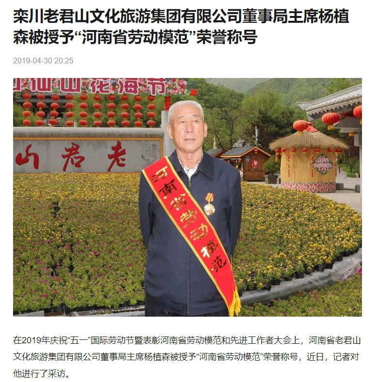 據欒川縣文化廣電和旅遊局官方微信“全景欒川”顯示,楊植森是當地有名的農民企業家,2007年,楊植森出資開發老君山旅遊,十餘年來完成了40多項重大旅遊設施的建設。在2019年慶祝“五一”國際勞動節暨表彰河南省勞動模範和先進工作者大會上,河南省老君山文化旅遊集團有限公司董事局主席楊植森被授予“河南省勞動模範”榮譽稱號。