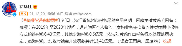 【環球網綜合報道】據新華社20日報道,近日,浙江省杭州市税務局稽查局查明,網絡主播黃薇(網名:薇婭)在2019年至2020年期間,通過隱匿個人收入、虛構業務轉換收入性質虛假申報等方式偷逃税款6.43億元,其他少繳税款0.6億元,依法對黃薇作出税務行政處理處罰決定,追繳税款、加收滯納金並處罰款共計13.41億元。