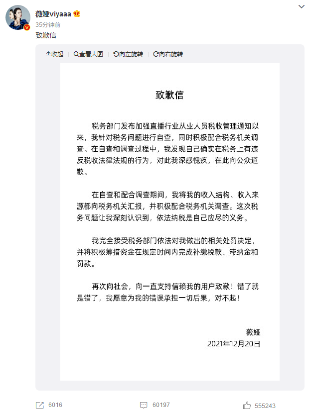 隨後,薇婭在個人官方微博上發文致歉,稱在自查和調查過程中,我發現自己確實在税務上有違反税收法律法規的行為,對此我深感愧疚,在此向公眾道歉;我完全接受税務部門依法對我做出的相關處罰決定;錯了就是錯了,我願意為我的錯誤承擔一切後果,對不起!