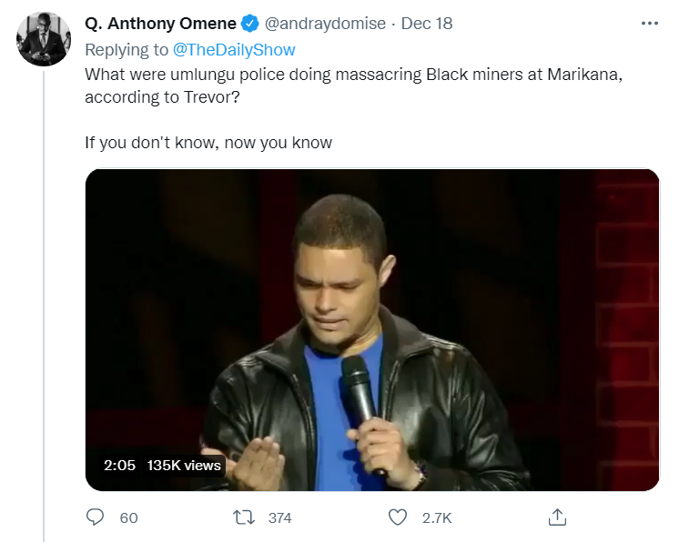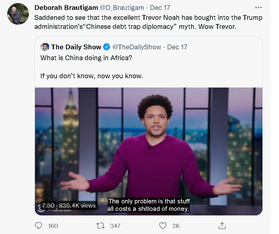 12月17日,美國著名脱口秀節目《崔娃每日秀》播出了一個名為“中國在非洲幹什麼”的視頻,稱中國正將海量的資金投入到當地的建設中。由於視頻的措辭有暗示中國“對非洲搞新殖民主義”的意味,引發了大量討論。然而,這幾天最先質疑和懟他的,是許多非洲網友和非裔美國人。