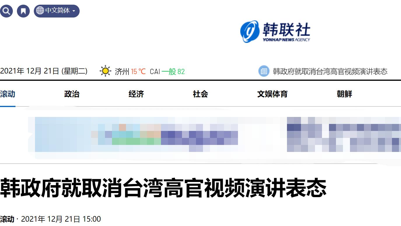 據台灣聯合新聞網20日報道,台“外交部”當天發佈新聞稿稱,韓國政府“第四次工業革命委員會”16日清晨臨時取消唐鳳原定在“2021第四次工業革命全球政策會議”的在線演講邀請,“對於韓方的失禮行為,已召見韓國駐台北代表部代理代表表達強烈不滿”,台北駐韓國代表處的唐殿文也同步向韓方表達嚴正抗議。台“外交部”發言人歐江安又補充説,韓方是以電郵通知唐鳳辦公室臨時取消邀請的,稱原因是“考慮兩岸關係各層面”。