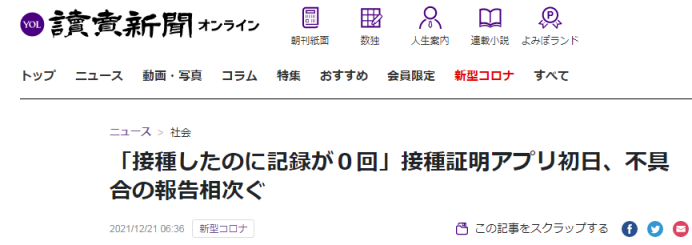 據報道,該APP被用於利用餐飲店、參加大型活動時的通行檢查,與日本政府資料庫“疫苗接種記錄系統”掛鈎,於20日開始正式運行。不過,據報道,有一部分民眾在登錄個人信息後發現APP顯示有誤,地方政府源源不斷地接到諮詢電話。僅在神奈川縣橫濱市一地,截至日本時間20日下午3時,就有超100件有關APP的諮詢電話,內容為“我接種了2次疫苗,但APP僅登錄了一次”等等。而在東京都內,也有大量民眾反映APP出現問題,“我接種了疫苗,但APP上顯示接種次數是0次”等等。