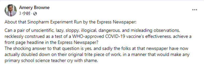 與此同時,《每日快報》還採訪了3名匿名醫生,這些醫生説,他們遇到的大多數有症狀新冠患者“或是未接種疫苗,或是已接種國藥疫苗”。其中一名醫生宣稱,他曾遇到“完成兩針國藥疫苗接種但仍病情嚴重的患者”。該報記者還電話採訪了英國國家醫療服務體系(NHS)顧問、免疫學者史蒂芬·敏特。敏特認為“國藥疫苗的數據不足,最好的疫苗是mRNA疫苗”。
