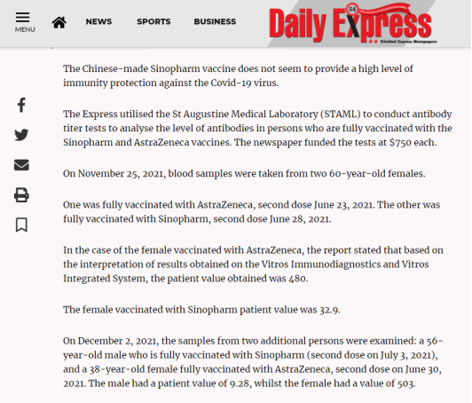 《每日快報》的報道在開頭即給出結論稱,“中國製造的國藥疫苗似乎不能提供針對新冠病毒的高水平免疫保護。”為證明這一説法,《每日快報》稱其通過該國的聖奧古斯丁醫學實驗室(STAML)對4名疫苗接種者進行中和抗體滴度測試。結果顯示,已接種阿斯利康疫苗的2人體內的“中和抗體滴度高於接種國藥疫苗的2人”。
