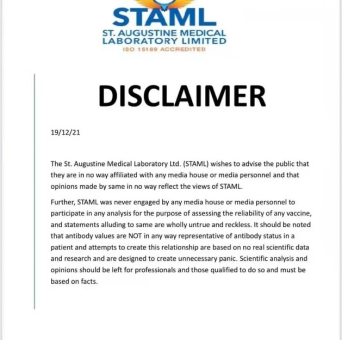 《每日快報》進行測試的聖奧古斯丁醫學實驗室19日也發佈聲明稱,該機構沒有受任何媒體委託,參與到以評估疫苗可靠性為目的的分析中。該實驗室強調,抗體滴度在任何情況下都不能代表患者的抗體狀態,試圖建立這種聯繫的行為並不是基於真正的科學數據和研究,而是旨在製造不必要的恐慌。聖奧古斯丁醫學實驗室主任拉姆薩蘭也在接受當地媒體採訪時表示,“用於得出(《每日快報》報道中)結論的測試方式絕對是錯誤的,這是向公眾傳播可怕的錯誤信息。”