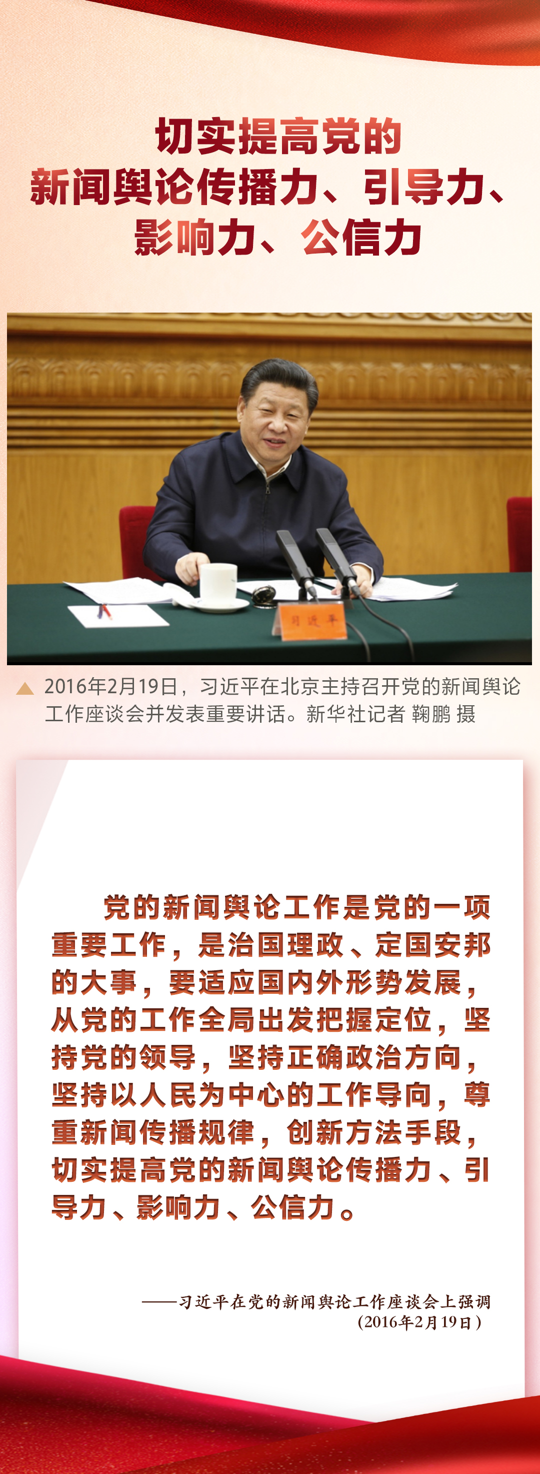 黨的十八大以來,習近平總書記高度重視黨的新聞輿論工作。2016年2月19日,習近平主持召開黨的新聞輿論工作座談會並發表重要講話 ,強調切實提高黨的新聞輿論傳播力、引導力、影響力、公信力,為做好新聞輿論工作指明瞭前進方向。