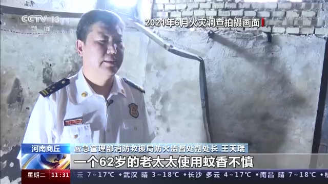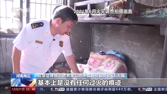 *應急管理部消防救援局防火監督處副處長 王天瑞:*經過模擬實驗、現場勘查、調查詢問,綜合認定這起火災事故是因為居住在這個房間的一個62歲的老太太使用蚊香不慎,引燃了方便麪紙箱子和周邊的衣物,造成了這起火災,這是火災的最終原因。