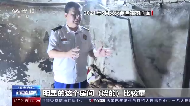 *應急管理部消防救援局防火監督處副處長 王天瑞:*明顯的這個房間(燒的)比較重,向外面依次減輕。看這個凳子,迎火面明顯的炭化比較嚴重,外面背火面基本上沒有燒損。所以説我們就排除了外部起火,把這個火災的(起火)部位鎖定在了這個房間。