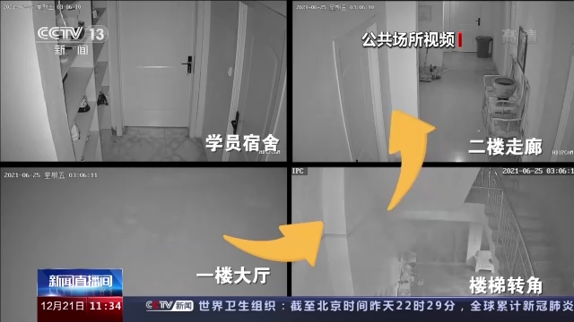 通過公共場所視頻看到:2021年6月25日凌晨1點58分,一層南側房間捲簾門上部縫隙隱隱約約有煙氣向外飄出,32分鐘後,已經很明顯看到大量濃煙從捲簾門上部縫隙湧出。幾乎與此同時,一名身穿白色睡衣的女士沿着事發建築內部樓梯向二樓走去。當她上到一半時突然停了下來,似乎覺察到了什麼,然而短暫停留後她又繼續上樓。來到二樓後,她僅是向學員住宿區的各個房間來回看了看,就迅速轉身下樓,整個過程用時不到一分鐘,此刻大火正在與她一牆之隔的房間內蔓延開來。如果這個時候她能發現火情,還能及時控制火勢,將二樓學員安全疏散,遺憾的是隔壁房間正在發生的火情並沒有引起她的警覺。濃煙越來越大,很快就充斥了整個畫面。