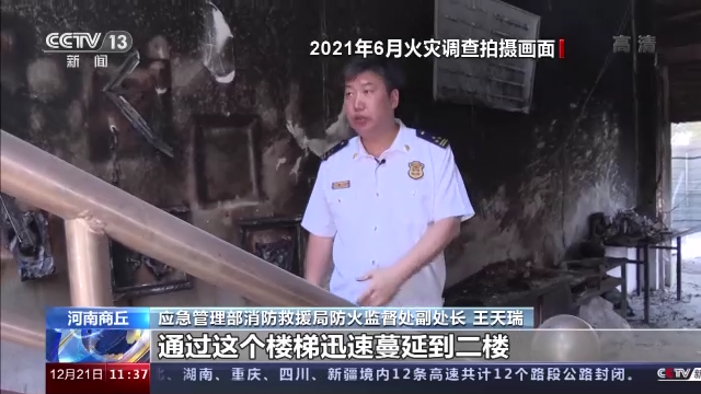 應急管理部消防救援局防火監督處副處長 王天瑞:(火災)突破彩鋼板後,通過這個樓梯迅速蔓延到二樓形成煙囱效應,加速了火災蔓延擴大,加速了一樓的煙氣向二樓流動,堵住了二樓人員唯一的逃生通道。