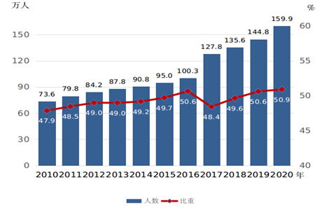 2020年,高等教育毛入學率為54.4%,比2010年提高27.9個百分點。高等教育在校生中女研究生人數為159.9萬人,佔全部研究生的比重達到50.9%,比2010年提高3.1個百分點(見圖4);普通本專科、成人本專科在校生中女生分別為1674.2萬人和450.6萬人,佔比分別為51.0%和58.0%,分別比2010年提高0.1個和4.9個百分點。