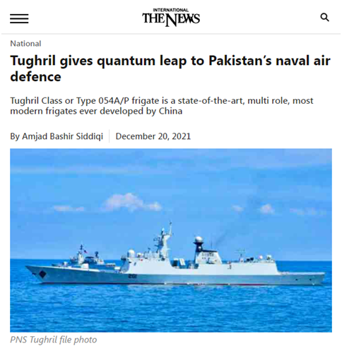 【環球網報道 記者 張海潮】據巴基斯坦媒體《國際新聞報》20日報道,中國製造的圖赫裏勒級護衞艦(Tughril Class,即054A/P)為巴基斯坦海軍防空帶來鉅變。此外,該艦配備的YJ-12超音速反艦導彈被認為是“航母殺手”,一些印度觀察人士擔心對印海軍現有的兩艘航空母艦形成威懾。