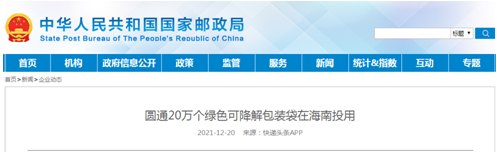 圓通在海南投放20萬隻綠色可降解包裝袋