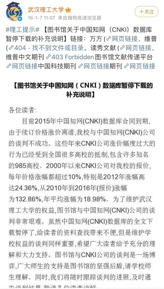 另外知網也出現因漲價遭遇多所高校抵制的情況,早在2016年,武漢理工大學曾發佈知網停用的通知,原因是續訂價格漲價離譜。該校表示,2000年以來,知網每年報價漲幅都超過10%。而年經費達幾百億的北京大學,也曾貼出停用知網的通知。