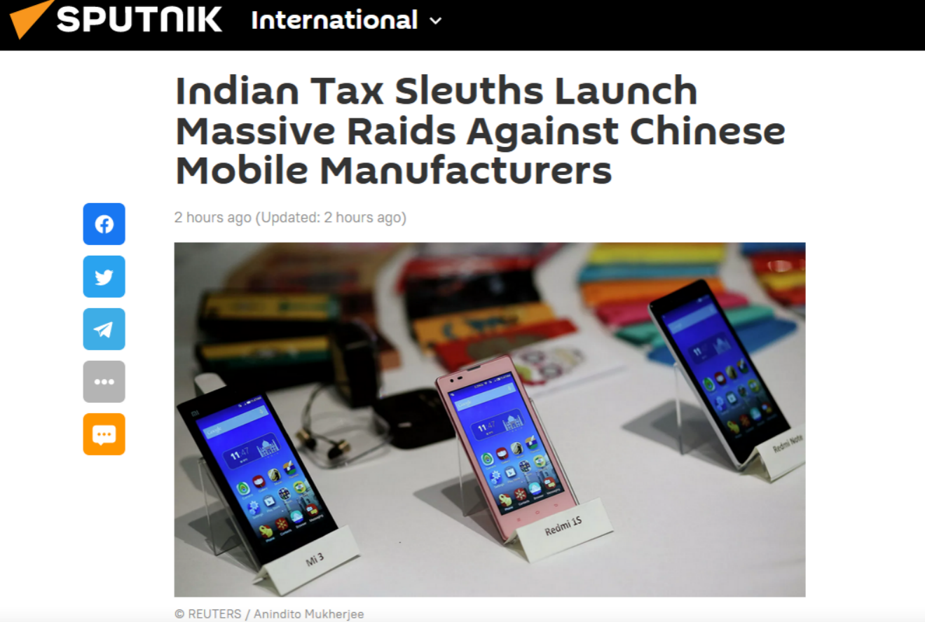 【環球網報道 記者 張曉雅】“印度税務偵查人員對中國手機制造商發起大規模突襲。”俄羅斯衞星通訊社22日以此為題報道稱,印度税務部門正在對一些在印中國移動設備廠商進行大規模突擊搜查,因為有消息宣稱,這些在印度市場佔有率合計超過46%的中國企業涉嫌“做假賬”。