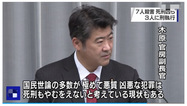 日本官方副長官木原誠二在內閣會議後的記者招待會上,談到日本死刑制度時表示:“死刑存廢是有關我國刑事司法制度根本的重要問題。應該在充分考慮國民輿論的前提下,慎重討論。許多民眾認為死刑是應對殘暴罪行的必要手段。我認為,在兇殘犯罪接連發生的情況下,對罪行極其嚴重的犯人執行死刑是必要的,廢除死刑是不合適的。”