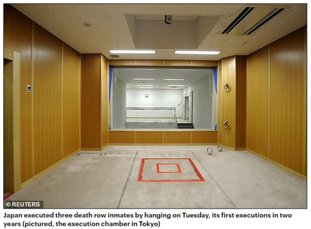 英國《每日郵報》指出,日本的死刑是通過絞刑執行。在行刑時,囚犯下方會有一個活動門,天花板上則有一根繩子。