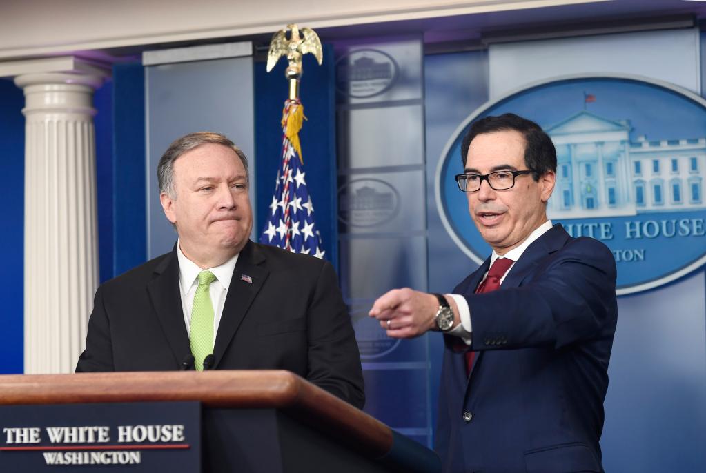 2020年1月10日,時任美國財政部長姆努欽(右)在華盛頓白宮舉行的記者會上發言。美國財政部當天宣佈對伊朗實施新的制裁,制裁對象包括伊朗8名高官和礦業公司等。(新華社記者劉傑攝)
